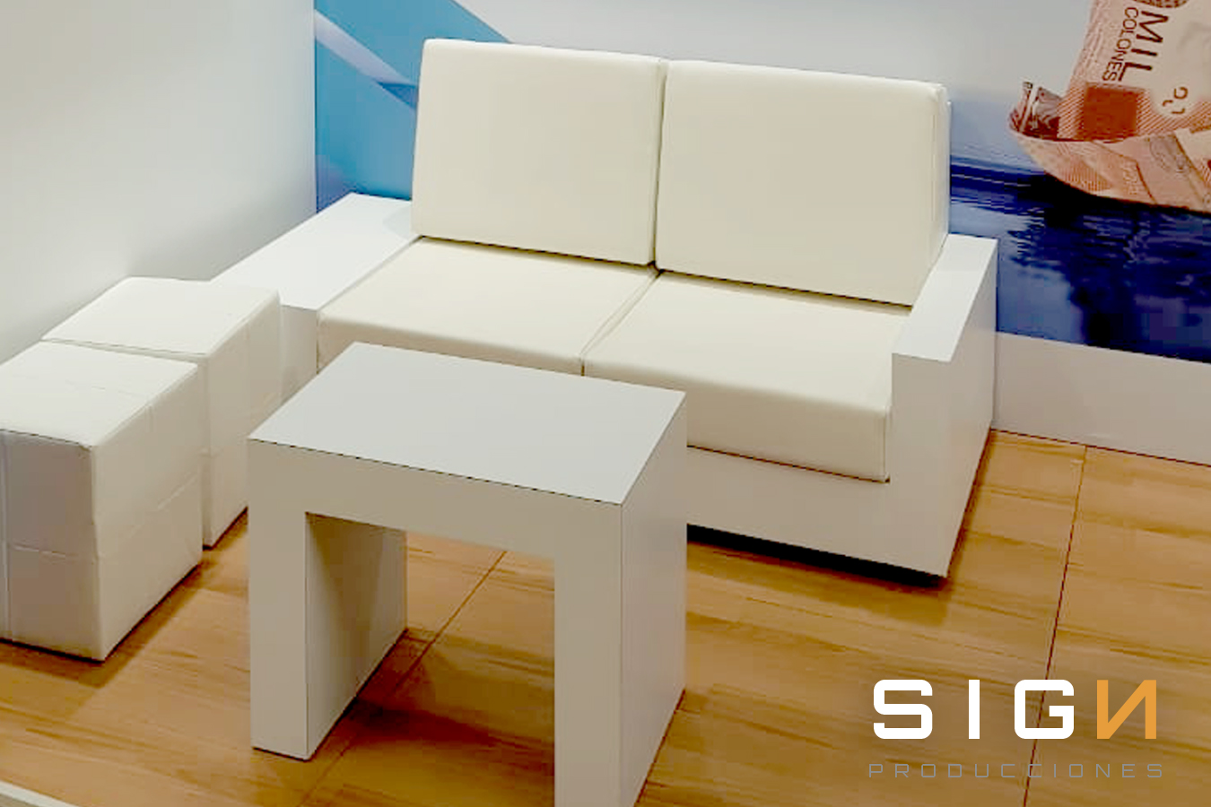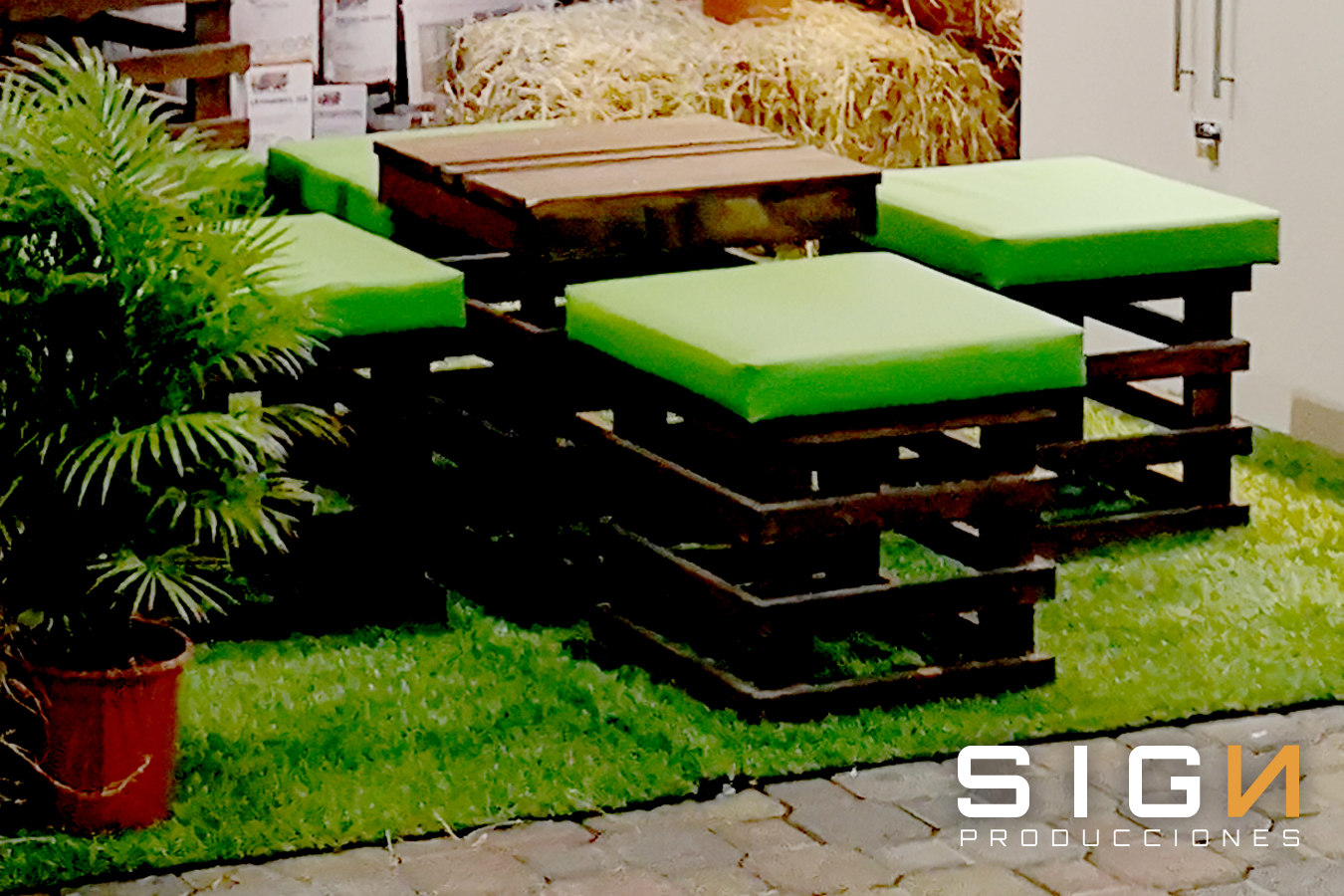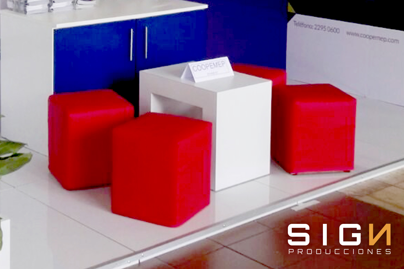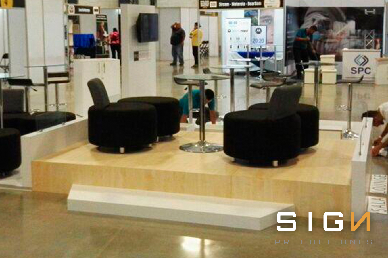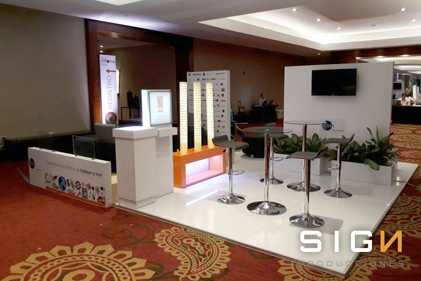 Sala lounge con mesas y sillas cocteleras, jardineras con y sin iluminación, panel lateral, Pantalla LCd, counter y piso modulado blanco.