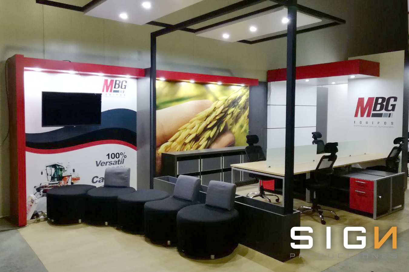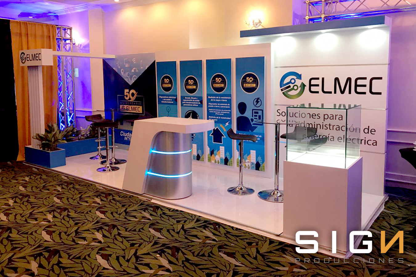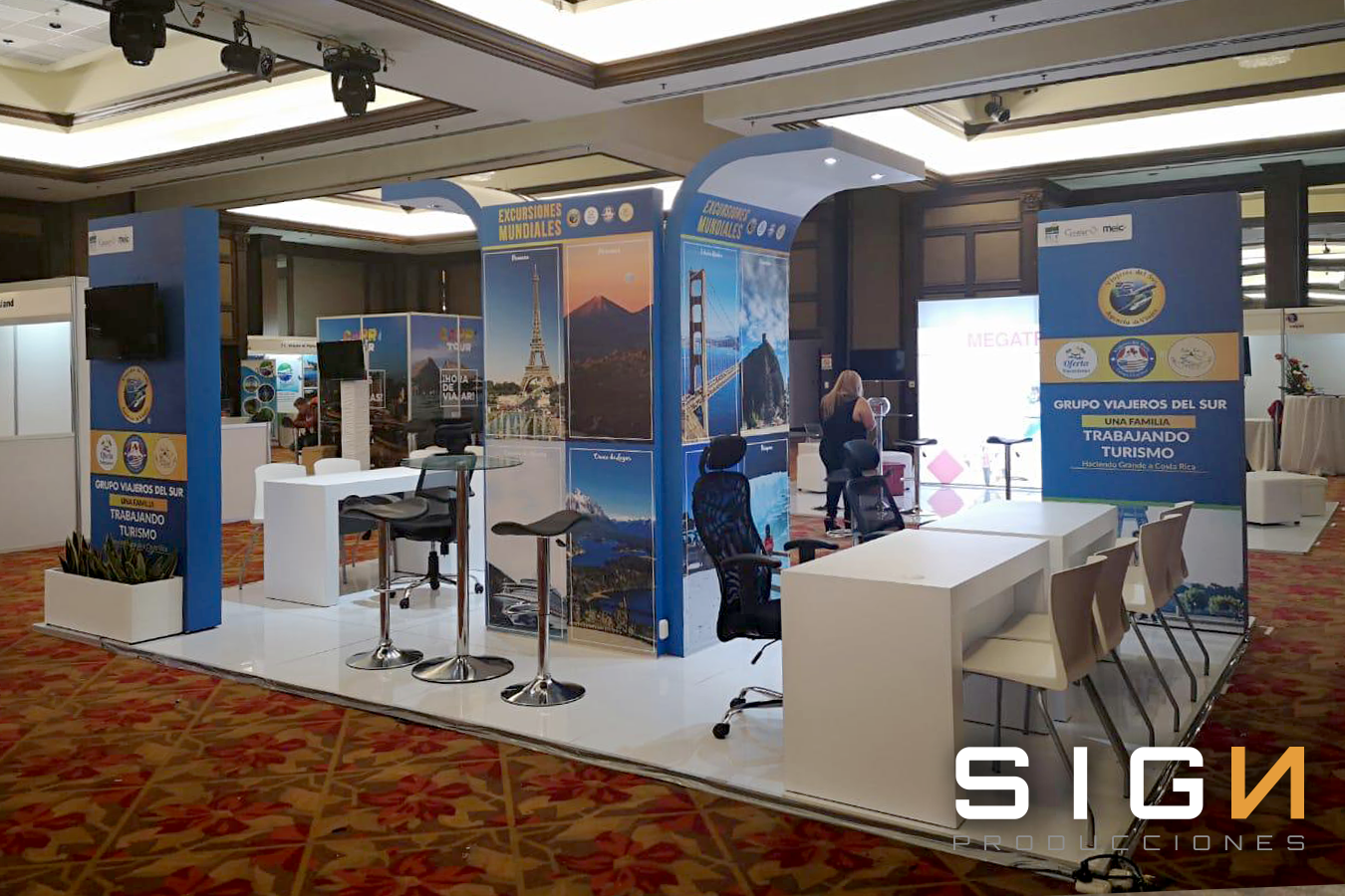 Diseño, Frabricacion y Montaje, Piso, Back Panel, Pared Lateral, Impresión Digital, Pantalla LCD, Sillas, Mesas.