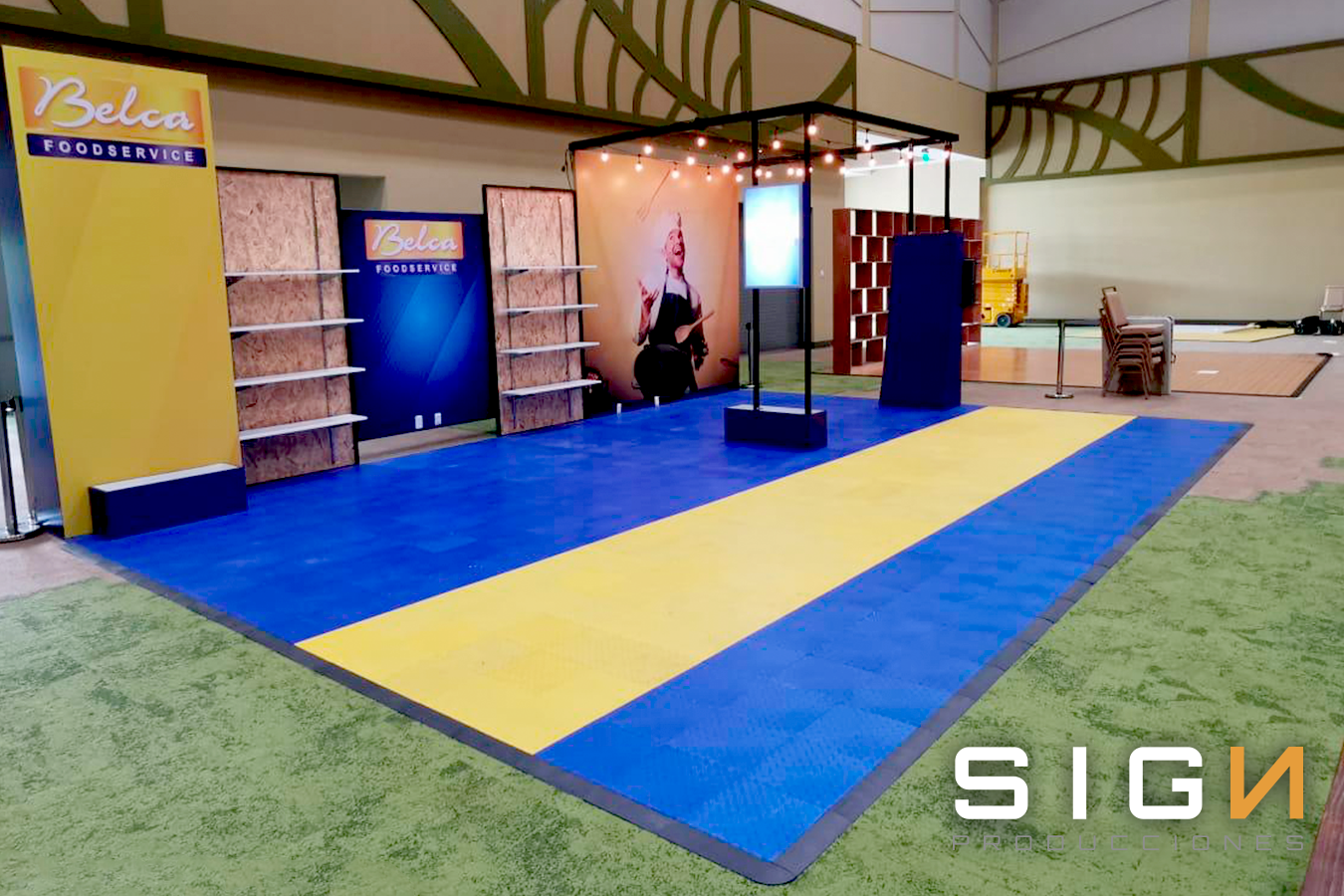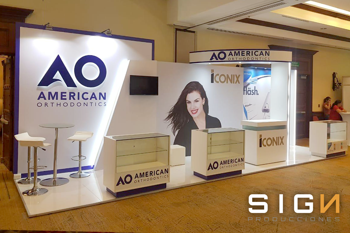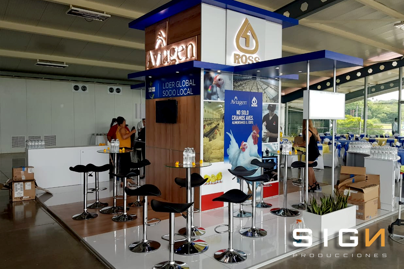 Diseño, Frabricacion y Montaje, Piso, Back Panel, Pared Lateral, Impresión Digital, Pantalla LCD, Sillas, Mesas.