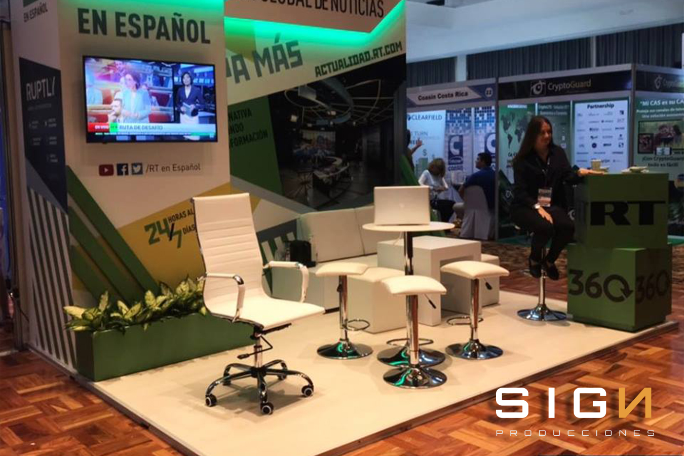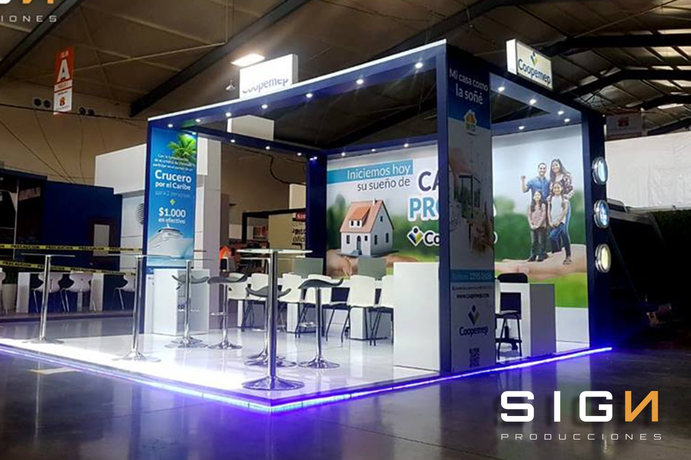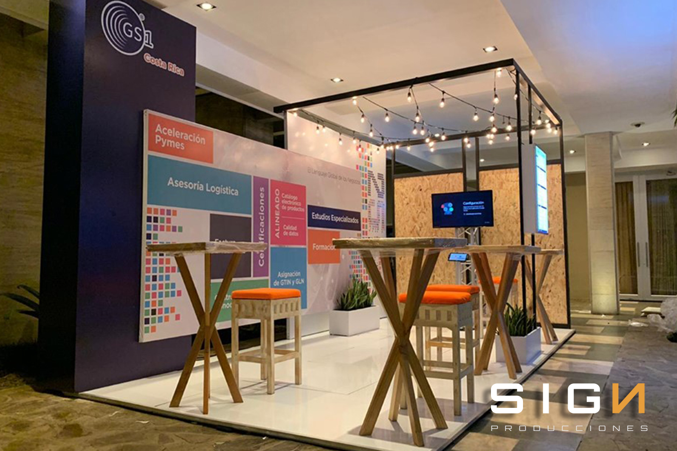 Diseño, Frabricacion y Montaje, Piso, Back Panel, Paredes Laterales, Area Lounge, Counter, Jardineras, Impresión Digital, Pantalla LCD, Sillas, Mesas.